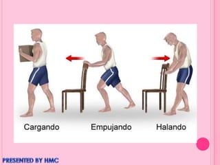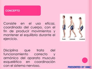 La mecánica corporal consiste en el uso coordinado del cuerpo para producir movimientos y mantener el equilibrio durante el ejercicio. Promueve el funcionamiento del sistema musculoesquelético y reduce la fatiga y el riesgo de lesiones mediante el movimiento adecuado. Algunos principios clave son mantener la espada recta, las piernas flexionadas, la carga cerca del cuerpo y los pies separados para ampliar la base de sustentación.