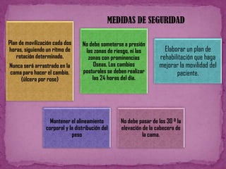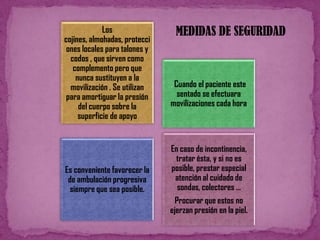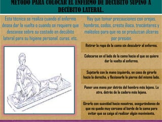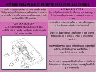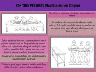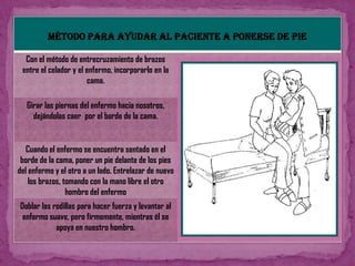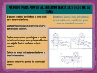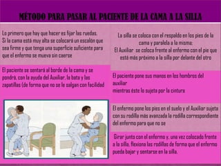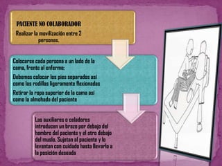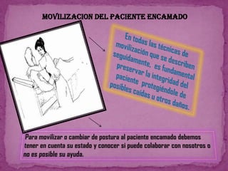 Este documento presenta las técnicas de mecánica corporal para auxiliares de enfermería. Explica cómo mover a pacientes encamados de manera segura, ya sea si pueden colaborar o no. Detalla las medidas de seguridad que se deben tomar al trasladar a un paciente de la cama a una silla o camilla, como protegerlo de caídas. Además, cubre técnicas para pacientes colaboradores y no colaboradores. El objetivo es preservar la integridad del paciente durante cualquier movimiento.