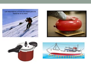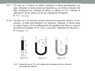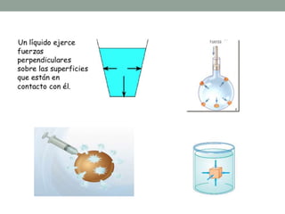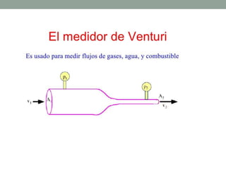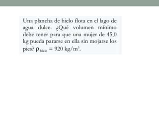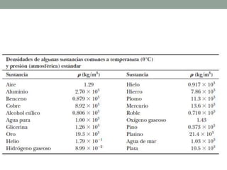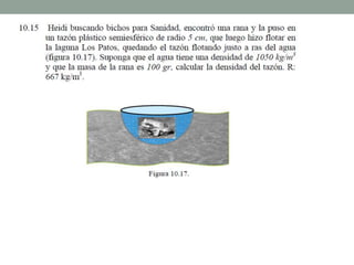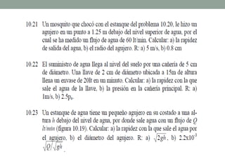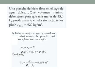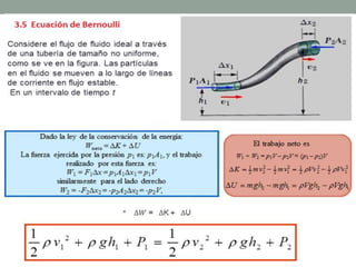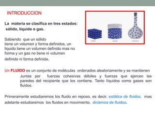 Este documento presenta conceptos clave de la mecánica de fluidos, incluyendo la presión en fluidos y su variación con la profundidad, el principio de Arquímedes y las fuerzas de flotación, y la ecuación de Bernoulli en dinámica de fluidos. Explica la clasificación de los estados de la materia, define fluidos, y discute ejemplos de aplicaciones importantes de la mecánica de fluidos como la circulación de sangre y el control del clima.