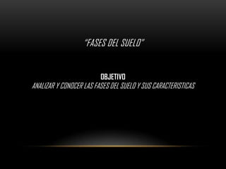 Este documento analiza las fases del suelo y sus características. Explica que un suelo está compuesto de minerales, materia orgánica, bacterias, agua y aire. Se compone de tres capas: la capa superior del suelo, el subsuelo y la roca madre. Describe la textura, estructura y estados del suelo como saturado, parcialmente saturado y seco.