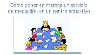 El documento describe el proceso de mediación para la resolución de conflictos en centros educativos. Explica que la mediación es un método voluntario y confidencial donde un mediador ayuda a las partes en conflicto a alcanzar un acuerdo. También detalla los pasos para implementar un servicio de mediación escolar y las fases del proceso de mediación, incluyendo definir el problema, ayudar a las partes a comprenderse mutuamente, y encontrar soluciones.