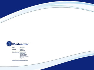 Medcenter es una compañía multinacional de servicios de educación e información médica que ha estado en el mercado por 12 años desarrollando proyectos con más de 80 laboratorios farmacéuticos en 21 países. Ofrecen soluciones en línea de educación médica, promoción de productos y relaciones para fortalecer la relación entre los laboratorios y médicos y aumentar la prescripción de medicamentos.