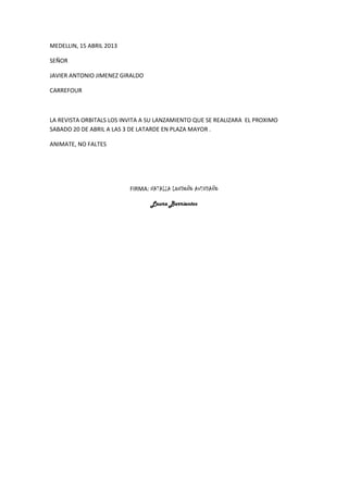 El documento contiene varias invitaciones para asistir al lanzamiento de la revista Orbitals el próximo 20 de abril a las 3 de la tarde en Plaza Mayor. Cada invitación va dirigida a una persona diferente de varias empresas e incluye la fecha, hora y lugar del evento, así como un mensaje alentando a los invitados a asistir y animarse.