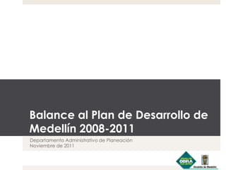 El documento presenta un resumen del balance del Plan de Desarrollo de Medellín 2008-2011. Se alcanzó el 95% de cumplimiento de las metas del plan. La inversión total fue de $9.7 billones, principalmente en líneas como desarrollo y bienestar para la población. Entre 2001-2010, el índice de calidad de vida aumentó un 23%, especialmente en las comunas más pobres. La economía de Medellín creció a una tasa promedio anual del 10% entre 2000-2011.