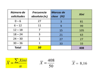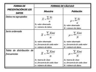 Este documento describe la media aritmética, que es una medida de tendencia central que identifica un valor representativo de un conjunto de valores. Calcula la suma de todos los valores y los divide por la cantidad de valores. Todas las propiedades son que todo conjunto de datos tiene una media única, todos los valores se incluyen en el cálculo, y la suma de las desviaciones de cada valor con respecto a la media es cero. También describe la media ponderada, que es un caso especial donde cada valor tiene una ponderación o nivel de importancia asociado.