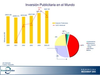 El documento presenta las principales conclusiones de un estudio sobre los medios de comunicación en Argentina en 2005. Algunas de las conclusiones clave son: 1) El crecimiento de la inversión publicitaria a nivel mundial y en Argentina, 2) La concentración creciente de la inversión en menos anunciantes, y 3) El incremento generalizado de los costos de los medios, con todos aumentando sus tarifas.