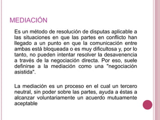 La mediación escolar es un método de resolución de conflictos en el que un mediador neutral ayuda a estudiantes en conflicto a alcanzar un acuerdo mutuamente aceptable. La escuela busca fomentar una cultura de resolución pacífica de disputas a través de su manual de convivencia. El modelo de mediación escolar también busca establecer liderazgos estudiantiles y abordar manifestaciones de violencia.