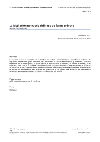 La mediación no puede definirse de manera unívoca debido a las variaciones en sus herramientas y protocolos según el ámbito de actuación, como el penal, familiar o laboral. Se propone una conceptualización amplia que permita adaptar técnicas a cada caso específico, promoviendo la flexibilidad y la autonomía de las partes. La efectividad de la mediación depende de la comprensión clara por parte de todos los actores sobre la modalidad utilizada en cada momento del proceso.