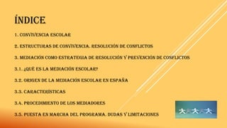 Este documento describe la mediación escolar como una estrategia para la resolución pacífica de conflictos en los centros educativos. Explica que la mediación escolar surgió en los años 70 en EEUU y llegó a España en los años 90 de forma experimental. También detalla el proceso de mediación, incluyendo las fases de premediación, presentación, narración de versiones y búsqueda de acuerdos. Finalmente, resalta la importancia de la formación de mediadores y el apoyo de toda la comunidad educativa para el éxito de un programa de