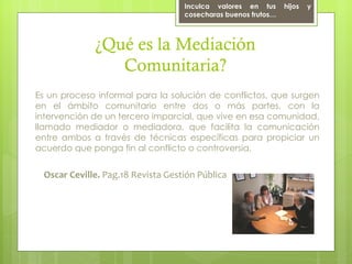 Este documento trata sobre la mediación comunitaria como herramienta para la solución pacífica de conflictos. Explica que la mediación comunitaria es un proceso informal donde un mediador imparcial facilita la comunicación entre dos partes en conflicto para lograr un acuerdo. También describe los principios de la mediación como la neutralidad, imparcialidad y confidencialidad, así como las ventajas de resolver conflictos a nivel comunitario de manera participativa, económica y rápida. Finalmente, menciona algunos ejemplos comunes de conflict