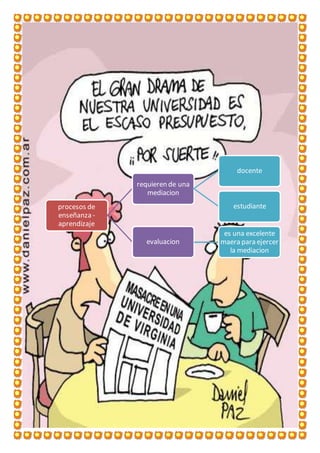 La evaluación como mediación implica que el docente acompañe y observe las acciones del estudiante para orientarlo y ayudarlo a interiorizar su propio aprendizaje como parte de un proceso constante de evaluación, ya que la mediación docente es importante en los procesos de enseñanza-aprendizaje.