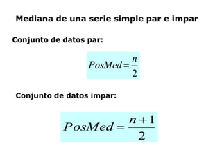 La mediana de una serie par se calcula como el promedio de los dos valores centrales. La mediana de una serie impar se calcula como el valor central. La mediana de una serie de frecuencias se calcula como el punto medio de la frecuencia acumulada total. La moda es el valor que se repite con mayor frecuencia. Para una serie con intervalos, la moda es el límite inferior del intervalo con mayor frecuencia.