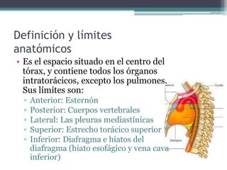 Este documento describe la mediastinitis, una inflamación de los tejidos mediastínicos. Define la anatomía del mediastino y describe los tipos de mediastinitis aguda y crónica, incluyendo las causas, síntomas, diagnóstico y tratamiento de cada tipo. La mediastinitis aguda puede ser secundaria a cirugía cardiotorácica, perforación esofágica o infección en la cabeza/cuello, mientras la crónica incluye mediastinitis granulomatosa o esclerosante.