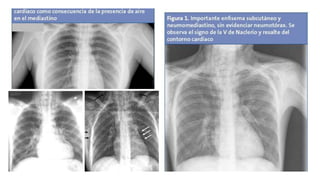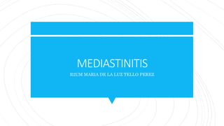 La mediastinitis es una inflamación de los tejidos del mediastino que puede ser aguda o crónica. La aguda puede deberse a una esternotomía media, perforación esofágica o extensión de infecciones adyacentes, y se manifiesta con dolor torácico, fiebre y disnea. La TC muestra colecciones líquidas, aire libre y engrosamiento de la grasa mediastínica. El tratamiento es antibiótico y puede requerir drenaje. La mediastinitis fibrosante es una enfermedad