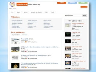 La mediateca es un espacio físico o virtual que ofrece recursos audiovisuales como CDs, DVDs y archivos digitales para buscar información o entretenimiento. Surgió en los años 80 con cintas VHS y casetes y se expandió en los 90 con más formatos digitales. Hoy en día las mediatecas ofrecen una amplia variedad de contenidos.