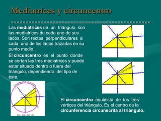 Este documento describe diferentes elementos geométricos asociados a un triángulo: las mediatrices, circuncentro y ortocentro se cortan en un punto que puede estar dentro o fuera del triángulo; las alturas se cortan en el ortocentro en un punto que también puede estar dentro o fuera; y las bisetrices se cortan en el incentro, que siempre está dentro del triángulo, al igual que la recta de Euler que pasa por el baricentro, circuncentro y ortocentro.