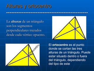 Este documento describe diferentes elementos geométricos asociados a un triángulo: las mediatrices, circuncentro y ortocentro se cortan en un punto que puede estar dentro o fuera del triángulo; las alturas se cortan en el ortocentro en un punto que también puede estar dentro o fuera; y las bisetrices se cortan en el incentro, que siempre está dentro del triángulo, al igual que la recta de Euler que pasa por el baricentro, circuncentro y ortocentro.
