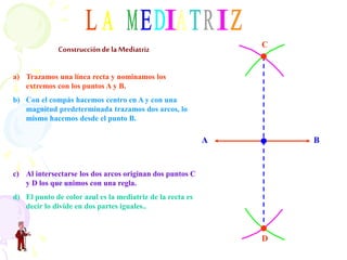 El documento explica cómo construir una mediatriz y una bisectriz. Para construir una mediatriz, se traza una línea entre dos puntos y luego se dibujan arcos desde esos puntos que se intersectan en otros dos puntos, uniéndolos con una línea que divide la recta original en dos partes iguales. Para construir una bisectriz, se dibuja un ángulo y luego se traza arcos desde su vértice que se intersectan en un punto, uniéndolo al vértice para dividir el ángulo en dos ángulos congruentes.