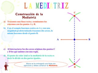 Este documento explica cómo construir la mediatriz y la bisectriz de un ángulo. Describe tres métodos para construir la bisectriz: 1) trazar arcos desde el vértice del ángulo y uniendo los puntos de intersección, 2) trazar rectas perpendiculares a los lados del ángulo, y 3) trazar arcos desde los lados del ángulo y uniendo los puntos donde se cortan las rectas trazadas entre dichos arcos. La bisectriz divide el ángulo en dos partes congruentes.
