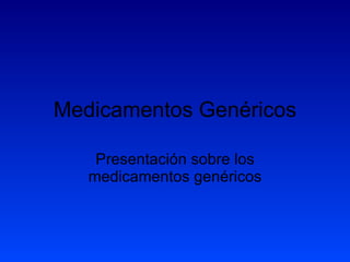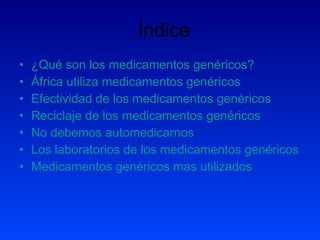Los medicamentos genéricos son aquellos que contienen el mismo principio activo que los medicamentos de marca originales y son bioequivalentes. África utiliza medicamentos genéricos sudafricanos para tratar el SIDA. Los estudios muestran que los medicamentos genéricos son igual de efectivos que los de marca. En España, casi 3,000 toneladas de medicamentos genéricos caducados se recogen anualmente para su reciclaje.