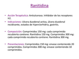 El documento proporciona información sobre varios medicamentos, incluyendo su composición, acción terapéutica, mecanismo de acción e indicaciones. Entre los medicamentos descritos se encuentran nifedipino para el tratamiento de angina y hipertensión, lactulosa para el estreñimiento y la encefalopatía hepática, omeprazol para úlceras y reflujo, y aspirina para el dolor y la inflamación. También se describen fragmin para la anticoagulación, atenolol para la hipertensión, y ranit
