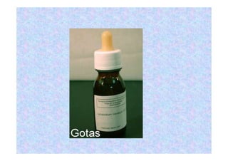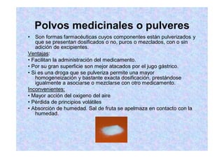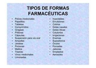 Este documento describe diferentes tipos de formas farmacéuticas, incluyendo polvos, papelillos, tabletas, comprimidos, grageas, píldoras, cápsulas, suspensiones orales, ampollas, jarabes, pociones, melitos, tisanas, vinos medicinales, limonadas, inyectables, emulsiones, colirios, gotas nasales, gotas óticas, colutorios e irrigaciones. Explica brevemente las características y usos de cada una de estas formas de administración de medicamentos.