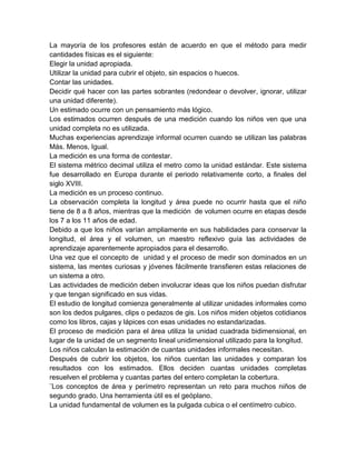 Este documento describe los conceptos y procesos fundamentales de la medición. La medición involucra asignar números a cantidades físicas como longitud, peso o volumen utilizando unidades estandarizadas. Para medir cantidades físicas se usa un proceso de iteración o aplicación repetida de la unidad sobre el objeto, mientras que para cantidades no físicas como el tiempo se usan métodos indirectos. El documento también explica principios básicos de la medición como el uso de una línea numérica y unidades iguales, y cómo las mediciones son aproxim