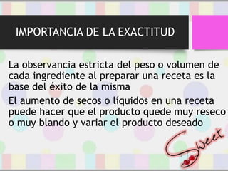 Este documento describe la importancia de medir con precisión los ingredientes al cocinar para obtener el resultado deseado. Explica que existen dos sistemas de medición, el internacional y el inglés, y proporciona equivalencias entre unidades de masa, volumen y temperatura de ambos sistemas. También incluye consejos para medir correctamente y tablas con equivalencias comunes de ingredientes en repostería.