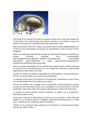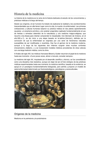 La historia de la medicina se remonta a las primeras civilizaciones humanas, donde se basaba en un enfoque empírico y mágico-religioso. Con el tiempo surgió la medicina técnica en Grecia y otras culturas desarrollaron modelos médicos complejos. En el siglo XIX la medicina se consolidó como disciplina científica, aunque sigue influenciada por prácticas anteriores.