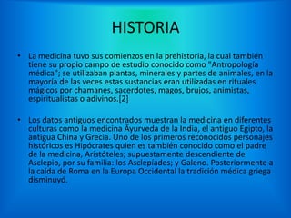 La medicina ha evolucionado desde la prehistoria, donde se usaban hierbas y rituales, hasta la medicina moderna, influenciada por figuras históricas como Hipócrates y Avicena. El desarrollo de la medicina contemporánea ha estado marcado por descubrimientos significativos en farmacología, genética y biomedicina, además de la creación de especialidades médicas diversas. Hoy en día, el conocimiento sobre el genoma humano y la tecnología médica son fundamentales en la diagnosticación y tratamiento de enfermedades.