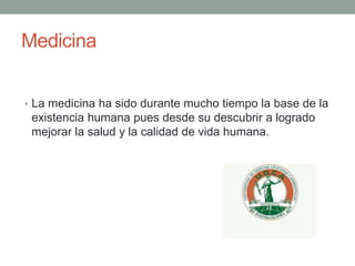 La medicina ha sido fundamental para mejorar la salud y calidad de vida humana a lo largo de la historia. Estudiar medicina requiere dedicación y sacrificio, pero ofrece una recompensa invaluable al servir a la comunidad. La verdadera curación proviene de las fuerzas naturales dentro de nosotros, como lo destacó Hipócrates.