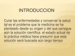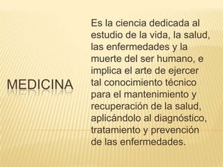 La medicina es la ciencia dedicada al estudio de la vida, la salud, las enfermedades y la muerte del ser humano. Implica el uso del conocimiento técnico para diagnosticar, tratar y prevenir enfermedades con el fin de mantener y recuperar la salud. La medicina ha estado presente desde la prehistoria cuando se usaban plantas y minerales en rituales mágicos, y su objetivo principal ha sido curar enfermedades y conservar la salud.