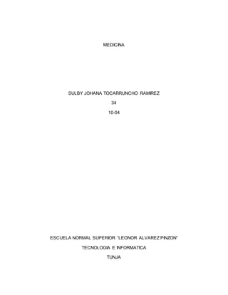 Este documento trata sobre la medicina. Explica que la medicina es la ciencia dedicada a la vida, salud y enfermedades del ser humano. Tiene como objetivos fomentar la salud y bienestar de los pacientes y aplicar conocimientos respetando normas éticas. Examina conceptos como el origen, fines y prácticas de la medicina, así como la importancia de la relación entre médico y paciente. Concluye resaltando la necesidad de saber formular conceptos y tener una buena relación con los pacientes.