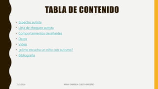 Este documento resume información sobre el autismo, incluyendo una descripción del espectro autista, una lista de chequeo de síntomas autistas, ejemplos de comportamientos desafiantes y datos sobre diagnósticos de autismo en Panamá en los últimos 4 años. También incluye enlaces a un video y fuentes bibliográficas.