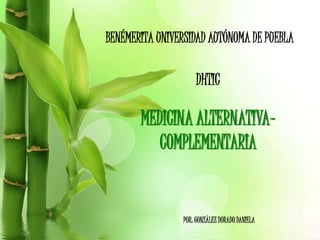 La presentación aborda la medicina alternativa y complementaria, destacando su enfoque en el bienestar y la prevención de enfermedades. Se describen diversas terapias y métodos que consideran la conexión entre mente, cuerpo y emociones, así como sus aplicaciones y beneficios. Se concluye que es crucial informarse sobre profesionales calificados en este campo para evitar riesgos y elegir opciones de tratamiento con menos efectos secundarios.