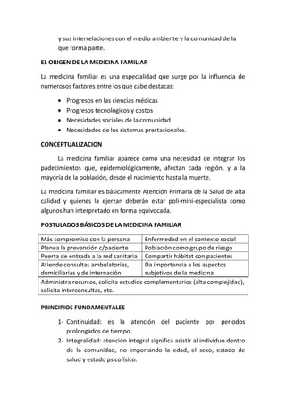 La medicina familiar es una especialidad médica que se enfoca en la atención primaria de salud de manera integral. Provee atención continua al paciente considerando factores familiares, sociales y de la comunidad. La medicina familiar se centra en la promoción de la salud, prevención de enfermedades y tratamiento de problemas de salud comunes de una población.