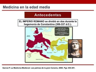 El documento describe la evolución de la medicina desde la antigüedad clásica hasta la Edad Media. Se destaca que Constantino dividió el Imperio Romano en dos, estableciendo Constantinopla como capital del este. Los árabes preservaron los textos médicos griegos y establecieron centros de enseñanza en Jundi Shapur y Bagdad. En Europa, la Escuela de Salerno fue pionera en la enseñanza médica secularizada y la anatomía humana se reanudó en Bolonia en el siglo XIV.