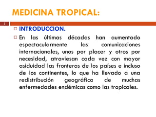 El documento habla sobre la medicina tropical. Explica que las enfermedades tropicales se transmiten principalmente por la picadura de insectos debido al clima cálido y húmedo de las zonas tropicales. También clasifica las diez principales enfermedades tropicales y describe factores como el reservorio, fuente, mecanismos de transmisión y población susceptible en la epidemiología de las enfermedades infecciosas. Finalmente, cubre temas como la prevención, vacunas y tratamiento de las enfermedades tropicales.