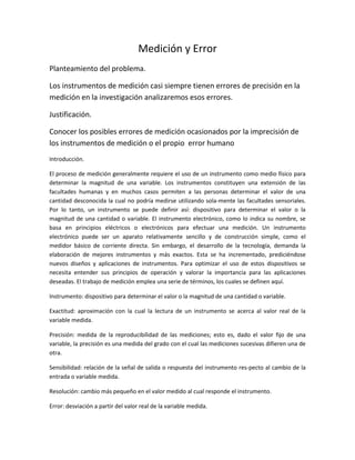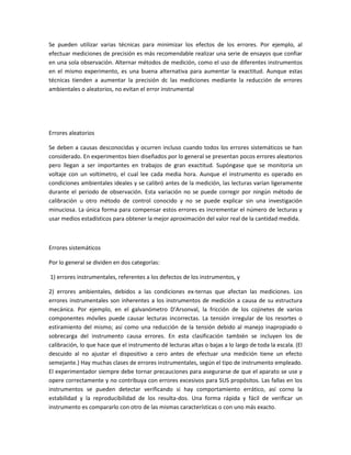 Este documento describe los tipos de errores que pueden ocurrir durante el proceso de medición, incluyendo errores aleatorios causados por factores desconocidos y errores sistemáticos causados por defectos en los instrumentos o condiciones ambientales. También explica cómo calcular la incertidumbre en las mediciones y formas de minimizar los errores, como usar varios instrumentos y métodos de medición.