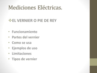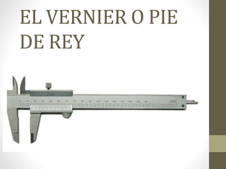 El documento habla sobre el vernier o pie de rey, un instrumento de medición precisa en milímetros. Explica su funcionamiento con una regla fija y una regla móvil con nonios que permite mediciones entre 0.25 a 0.02 mm. Detalla las partes, cómo usarlo correctamente midiendo exteriores e interiores, y ofrece ejemplos de medición. También menciona algunas limitaciones como su uso para objetos en movimiento.