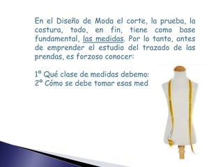 Este documento describe las medidas fundamentales que se deben tomar para el diseño de moda y cómo se deben tomar dichas medidas. Explica el orden en que deben tomarse las medidas para toda prenda de vestir, incluyendo el talle de la espalda, el contorno del busto, la altura del costado, y el largo de atrás y de adelante. Luego proporciona instrucciones detalladas sobre cómo tomar correctamente cada medida, colocando la cinta en la posición adecuada y sin apretar demasiado.