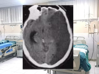 Este documento describe los diferentes tipos de edema cerebral, incluyendo el edema vasogénico, el edema citotóxico y el edema intersticial. Explica que el edema vasogénico es el más común y se produce cuando aumenta la permeabilidad de los capilares cerebrales, lo que causa una acumulación de líquido en el espacio extracelular del cerebro. También describe los síntomas clínicos asociados con la hipertensión intracraneal y los tratamientos como los glucocorticoides, las soluciones hipertónicas y la hiper