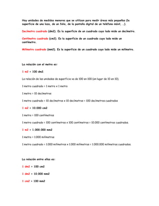 Este documento describe las unidades de medida para superficies como el metro cuadrado, decímetro cuadrado y centímetro cuadrado. Explica las relaciones entre estas unidades, así como cómo convertir entre unidades mayores y menores multiplicando o dividiendo por 100 para cada nivel de cambio.