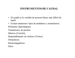 El documento describe diferentes instrumentos para medir caudal, destacando la complejidad de esta variable en procesos. Se presentan diversos medidores, como placas de orificio, tubos Venturi, medidores de vórtices y transmisores de caudal másico, cada uno con sus principios de funcionamiento y características específicas. También se enfatiza la importancia de los requisitos de instalación y el impacto de la turbulencia en las mediciones.