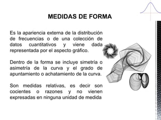 Este documento describe medidas de forma como la simetría, asimetría, apuntamiento y achatamiento de distribuciones de datos. Explica cómo calcular el coeficiente de asimetría de Pearson y Fisher para determinar si una distribución es simétrica o asimétrica, y el coeficiente de curtosis de Fisher para determinar si una distribución es mesocúrtica, leptocúrtica o platicúrtica. También presenta ejemplos prácticos de cálculos de estos coeficientes.