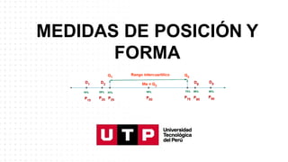 Este documento trata sobre medidas de posición y probabilidades. En la sesión, el estudiante aprende sobre medidas de posición como cuartiles, deciles y percentiles, y cómo calcular e interpretar estas medidas para un conjunto de datos. El objetivo de la sesión es que el estudiante sea capaz de calcular e interpretar medidas de posición y de forma para analizar un conjunto de datos.