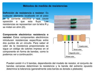 Este documento describe diferentes métodos para medir resistencias, incluyendo medición directa, código de colores, voltímetro, amperímetro, puente de Wheatstone y puente de hilo. Explica que una resistencia es cualquier elemento que causa oposición al flujo de corriente eléctrica y se mide en ohmios. También describe cómo el código de colores en los resistores indica su valor y tolerancia.