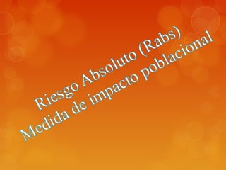 Este documento presenta diferentes medidas de riesgo utilizadas en epidemiología, incluyendo el riesgo absoluto, riesgo relativo, razón de momios y riesgo atribuible. Define cada medida y ofrece fórmulas para su cálculo. Además, incluye ejemplos numéricos para ilustrar el cálculo e interpretación de estas medidas de asociación entre factores de riesgo y resultados de salud.