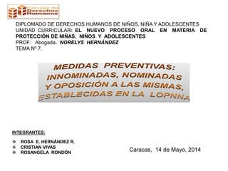 Este documento describe las medidas preventivas que pueden decretar los jueces en los procesos de protección de niños, niñas y adolescentes de acuerdo a la Ley Orgánica para la Protección del Niño y del Adolescente. Explica que estas medidas pueden ser nominadas o innominadas y tienen como objetivo garantizar los derechos y el interés superior de los niños. También cubre aspectos como los requisitos para decretar medidas preventivas, la audiencia de oposición y el recurso de apelación contra las decisiones sobre medidas preventivas.