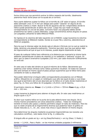 Este documento presenta un manual para construir un medidor de paso de hélices. Explica que el medidor permite medir el paso de las palas de una hélice para asegurar que sean iguales y que la hélice tenga el paso correcto. Describe los materiales y pasos necesarios para construir el medidor, incluida una base, cursor y escala. También incluye información sobre cómo usar el medidor para medir el paso de una hélice en diferentes radios y convertir los ángulos de medición en valores de paso.